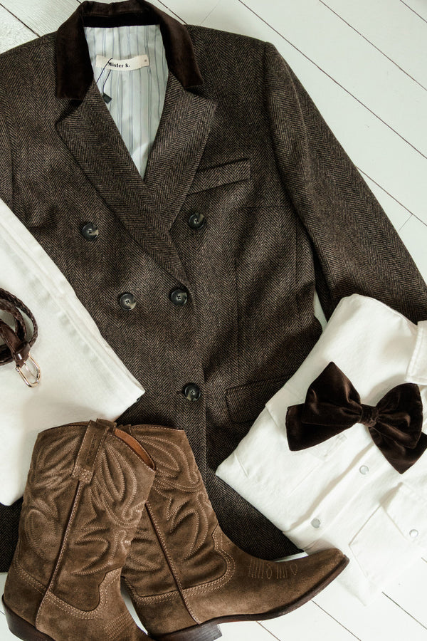 Associer des santiags à un blazer chevron et une blouse fluide ou à un pantalon droit complète l’ensemble tout en restant fidèle à l’identité recherchée. Chez Mister k., chaque collection invite à oser combiner selon vos envies.