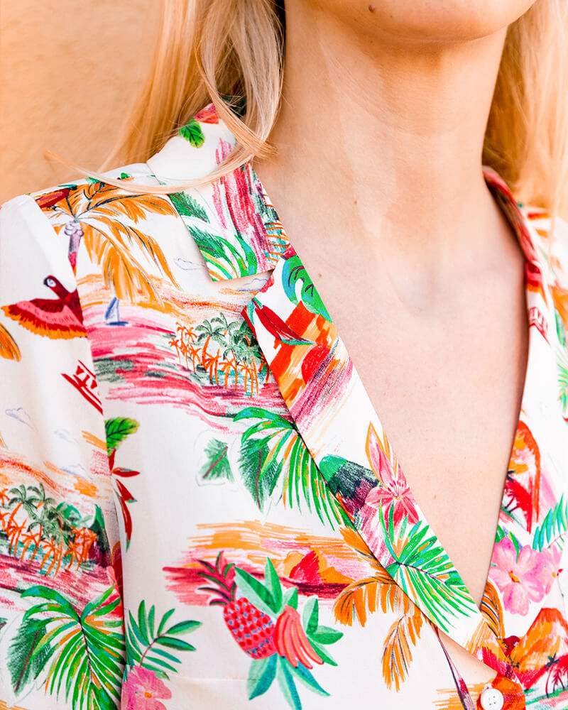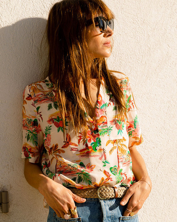 Our shirt with short sleeves and a relaxed fitIt returns in our new Hawaiian print of the season, designed exclusively in 100% silk crepe de Chine, with an ideal weight of 102g, developed by our Italian specialist. Unique cut, designed by Charlotte and developed in Paris.