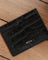 Format idéal : plat et rectangulaire - 2 grandes fentes sur le devant - logo marqué à chaud et doré - 4 fentes format carte de crédit sur le dos - poche milieu -finitions bords francs teintés - doublure unie noire 100% coton