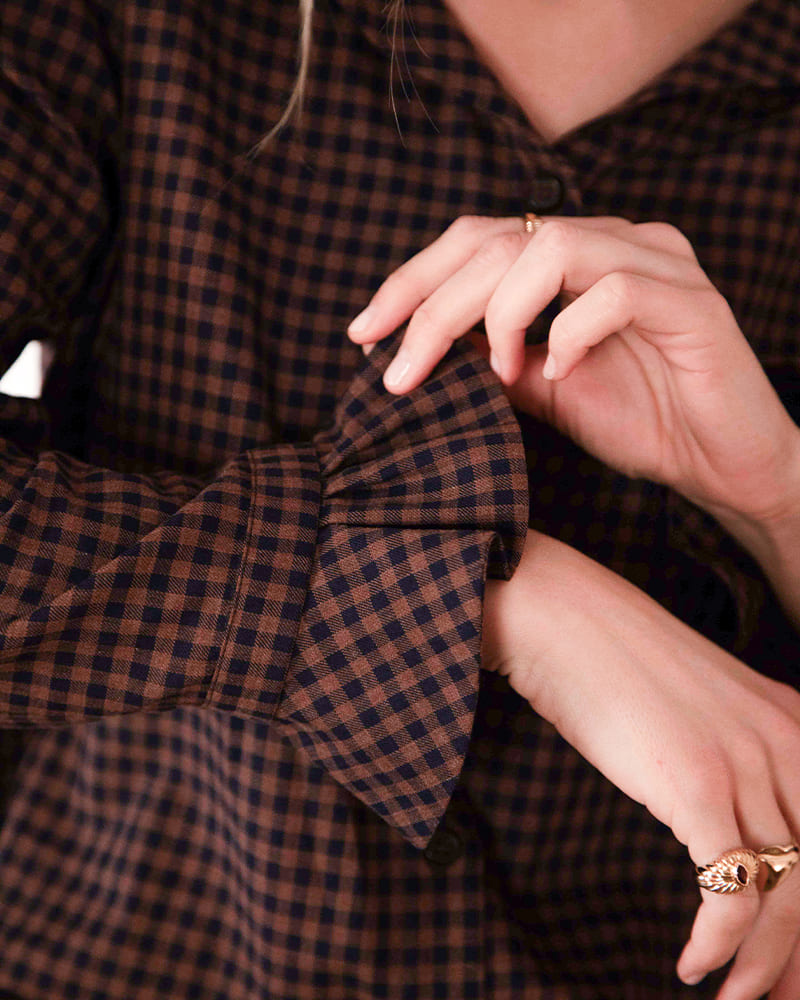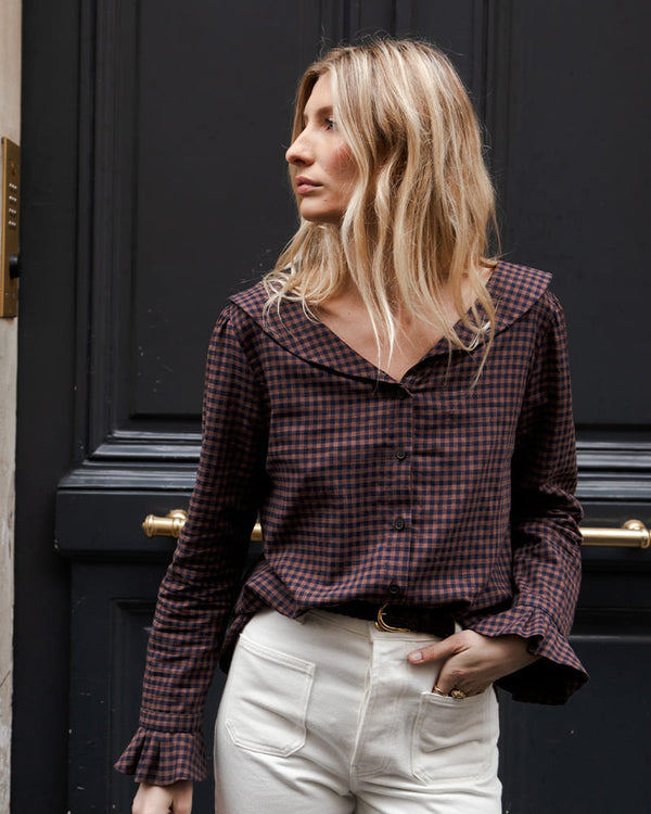 We present to youa new version of our Mimsy blouse that can be worn front/backMimsy is draped in a sumptuous, soft and elegant flannel, combining shades of brown and navy.