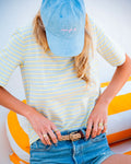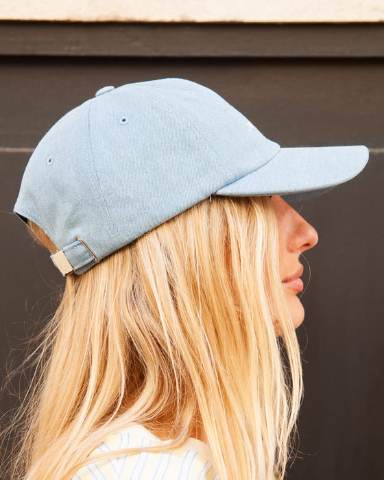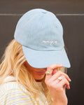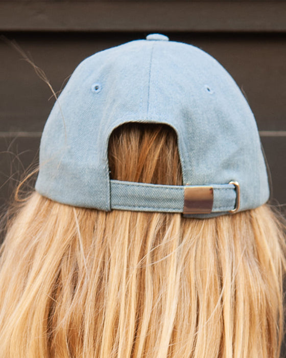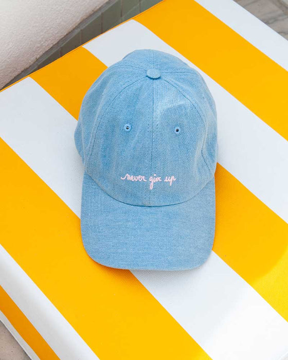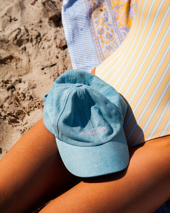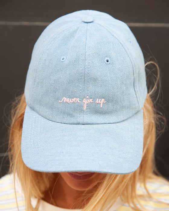 Our cap is back, in 100% cotton light blue denim,embroidered with ouriconic mantra "Never Give Up" in powder pink thread.Lewis is part of our zero waste commitment, made in Poland from leftover denim stock.