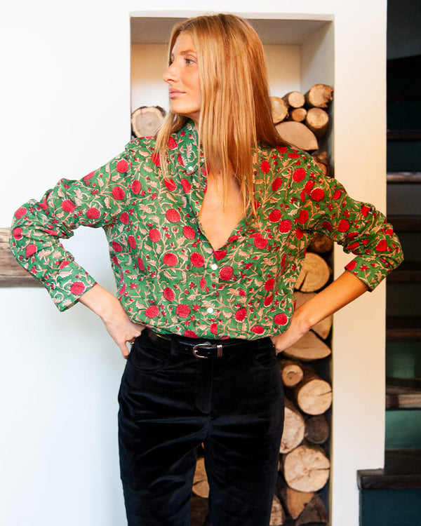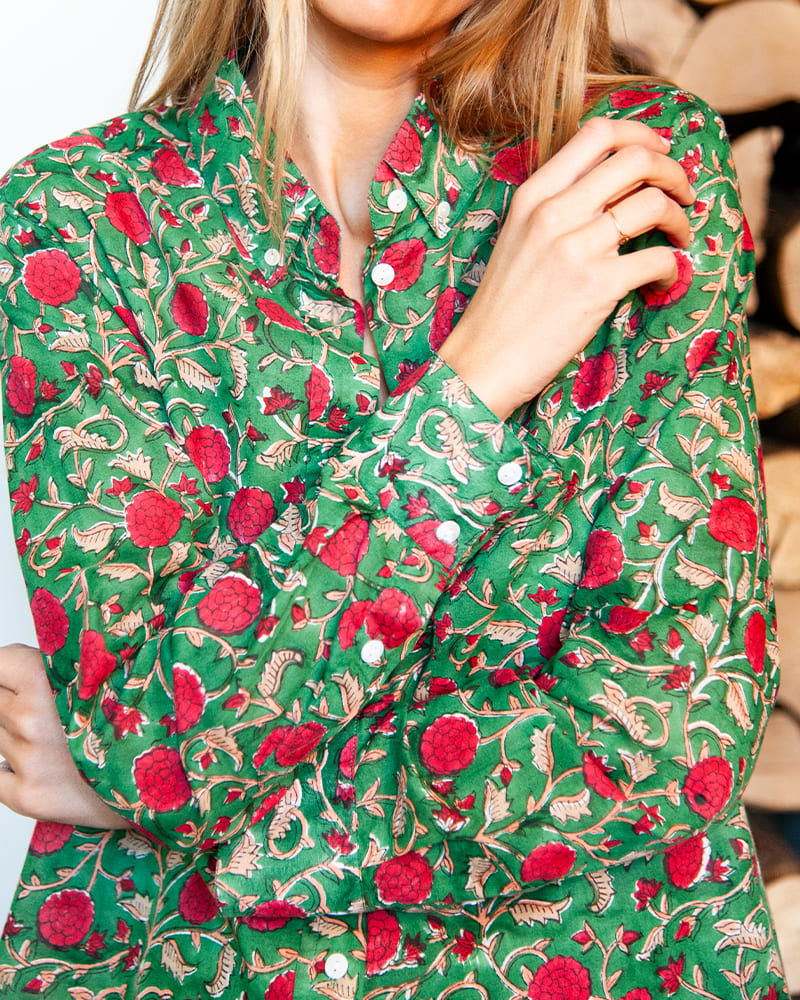 Our iconic cut shirtsince 2018 has draped itself for the first time in aGreen block print with red flowers, 100% cotton(Indian craftsmanship)pattern created exclusively with Rakeshin his family workshops. Block printing is a traditional printing technique and is printed by hand; the patterns may be irregular.