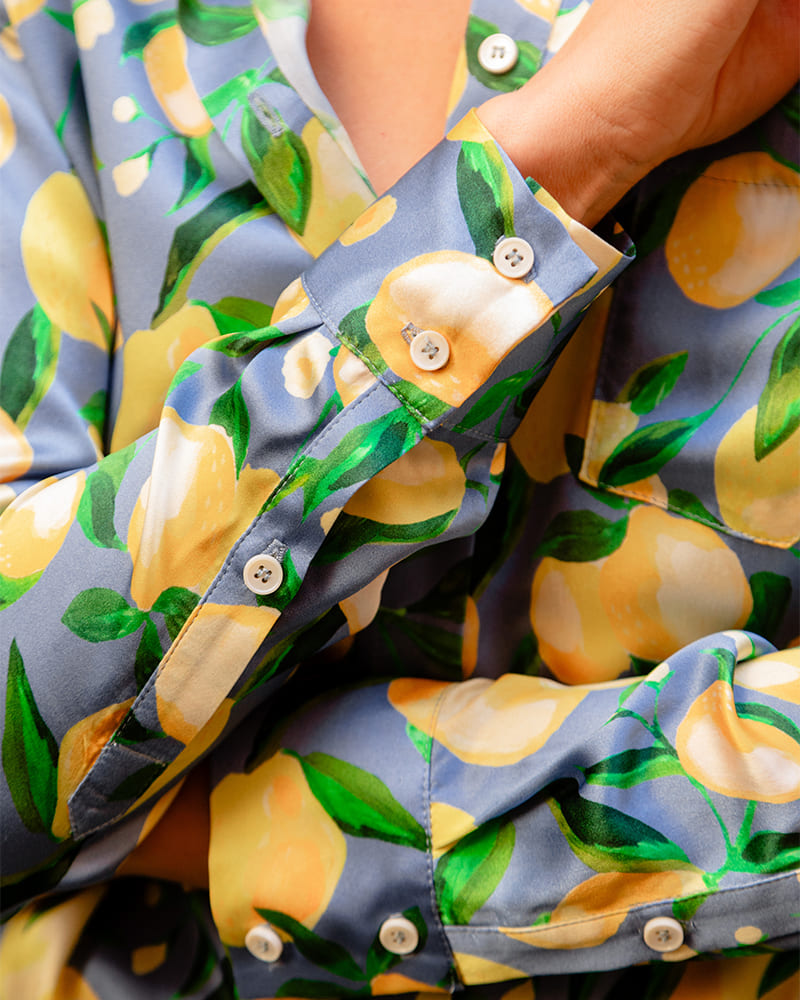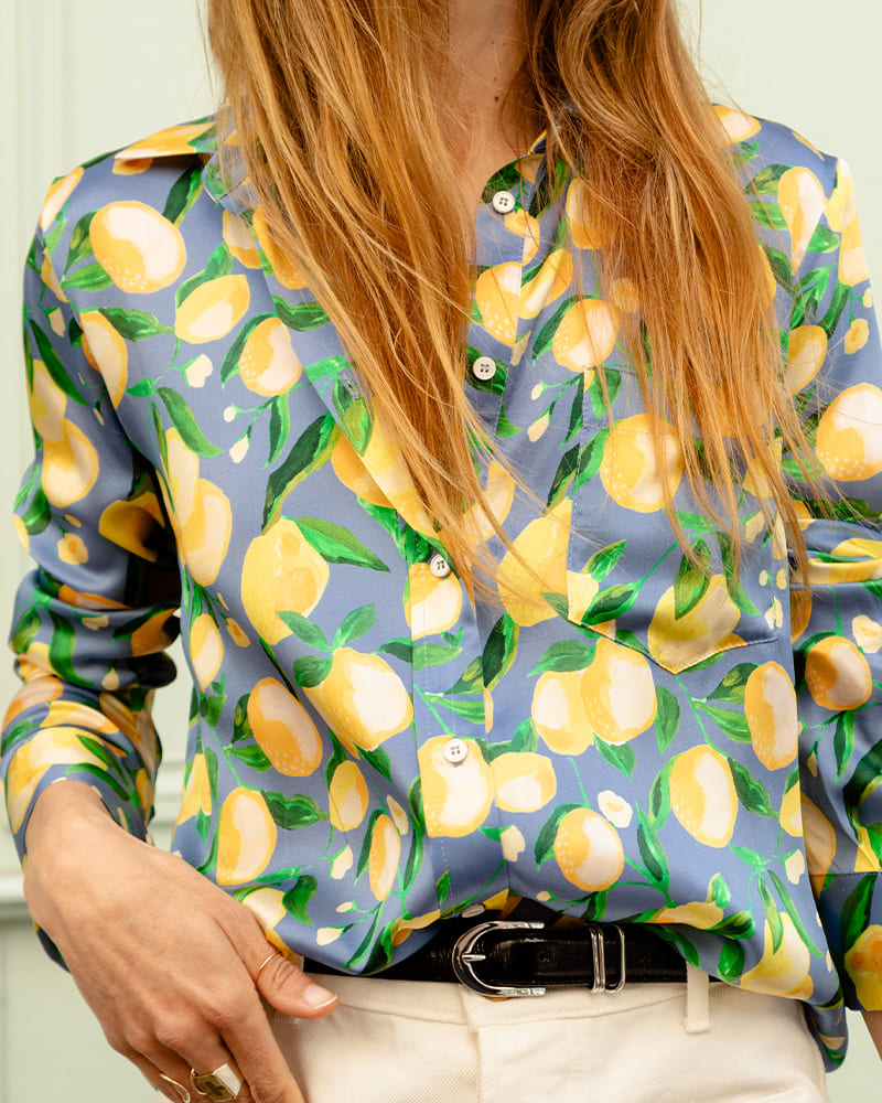 Notre imprimé citrons (exclusif) que l'on a dessiné avec l'illustratrice Laure est imprimé sur un divin satin de soie brillant ! Base de prêt à teindre ZERO GACHIS (satin de soie déjà existant), réglementée REACH.