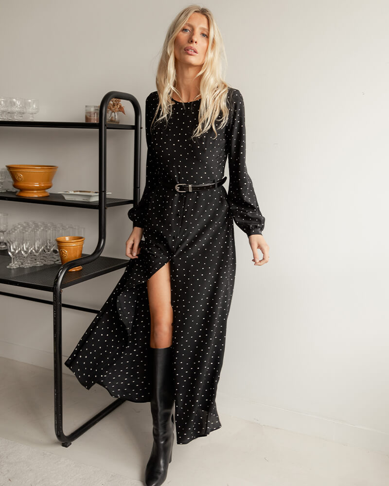 Notre robe longue à manches longues, parfaite pour la saison automne-hiver. Elle est boutonnée sur le devant à partir de la taille et sur le dos. Lison est drapée de notre imprimé iconique léopard. Pour la sublimer nous l'avons drapé d'un fabuleux crêpe de chine pois.