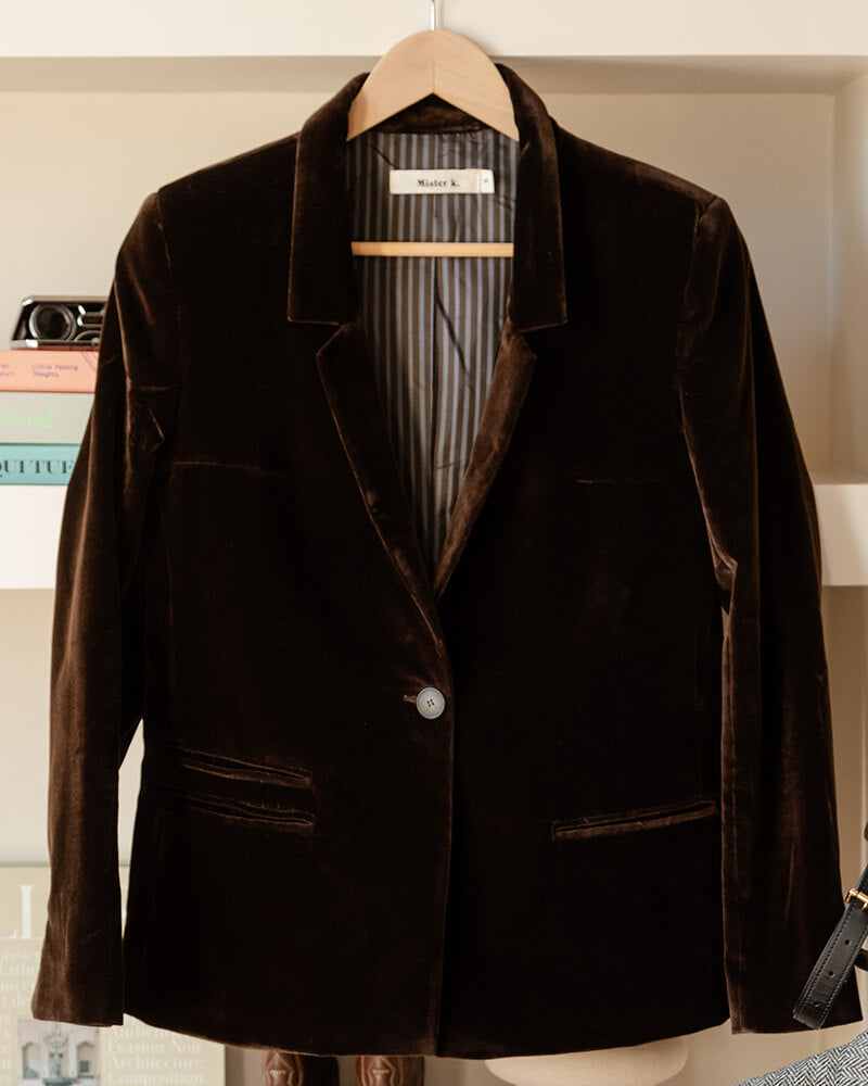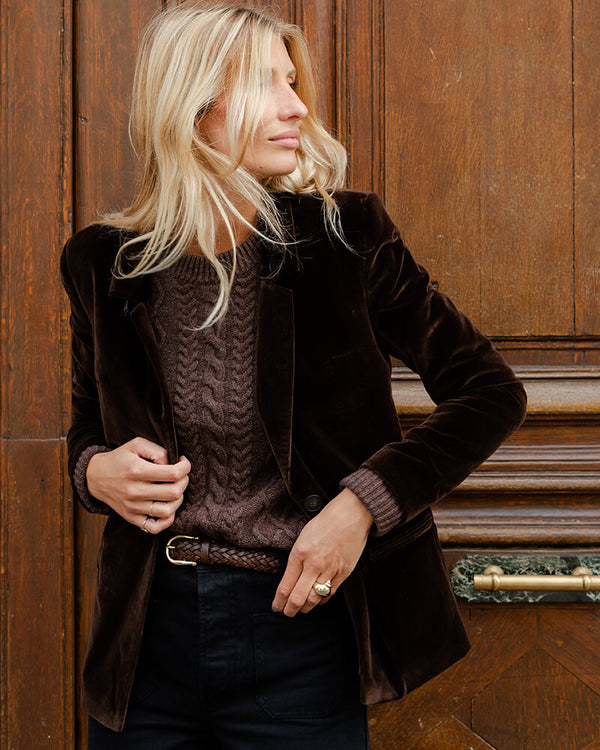 Our Lionel blazer with a tailored, fitted cutFor this version, we found her a sumptuous smooth chocolate velvet. Its unique cut: designed by Charlotte, developed by Jean-Michel, our favorite Parisian pattern maker.