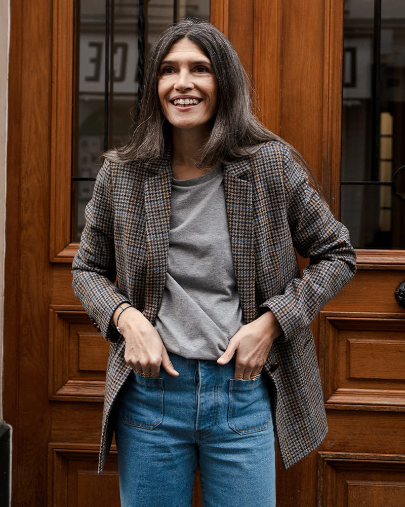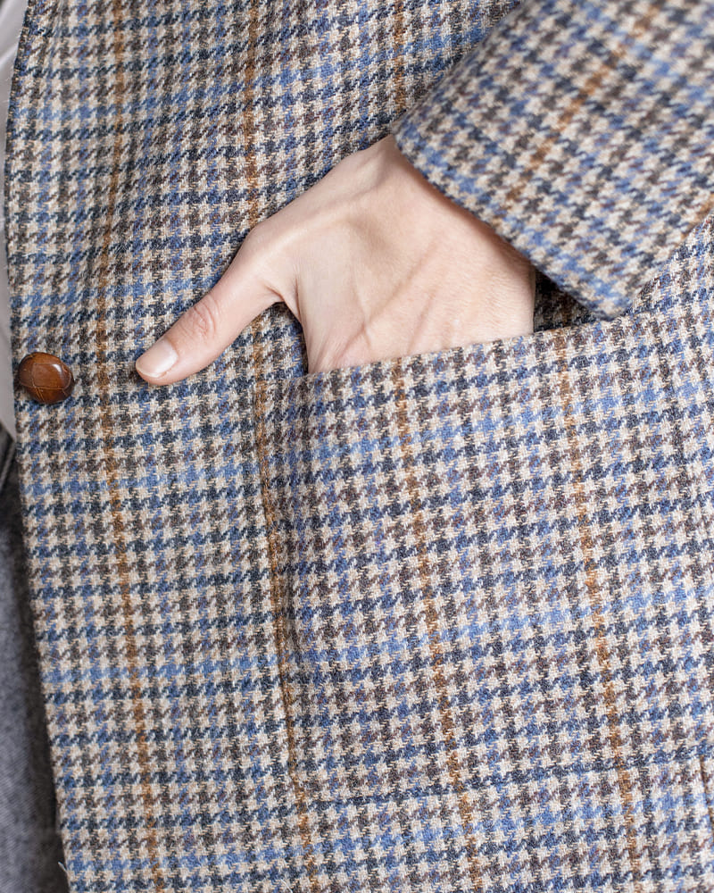 Our oversized single-breasted blazerIt is draped in a sumptuous, sublime 100% wool tweed with a grey and blue houndstooth pattern, ideal for year-round wear. The weaving is entirely done in Portugal at our partner supplier's factory. Marcello isMade in Polandin our workshopspecialist in sleeved garments.
