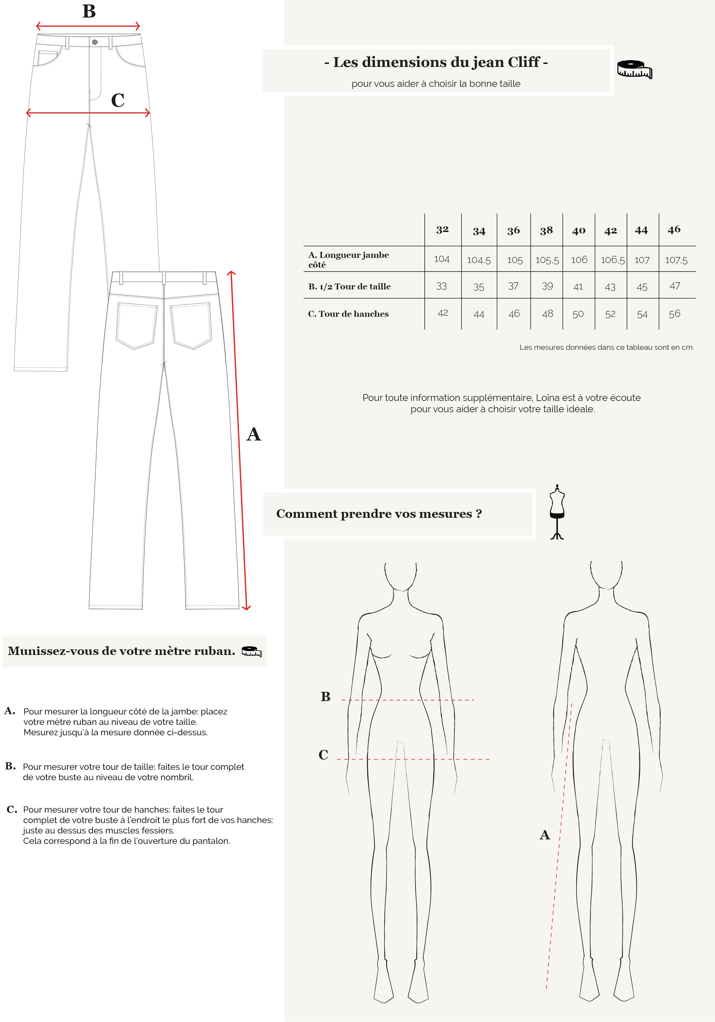 Pour mesurer la longueur côté de la jambe: placez votre mètre ruban au niveau de votre taille. Mesurez jusqu’à la mesure donnée ci-dessus.