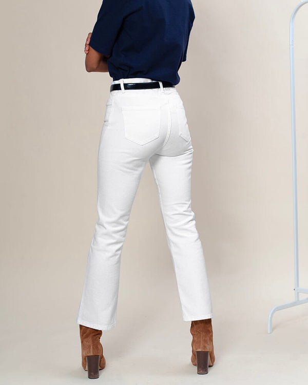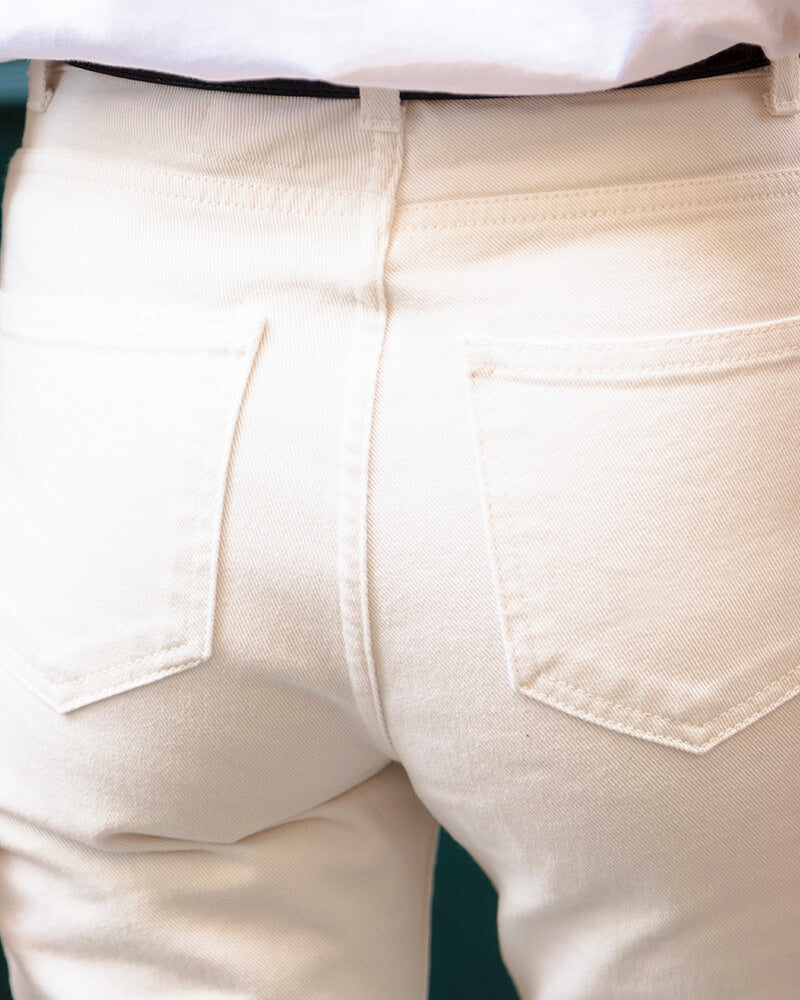 Jules, notre jean parfait dans sa coupe "Bootcut". Drapé d'une véritable toile denim blanc "zéro gâchis" en sergé 100% coton épais et sans stretch évidemment, parce qu'il n'y a rien de plus chic. Coupe unique, dessiné par Charlotte et développé par notre modéliste au Portugal.