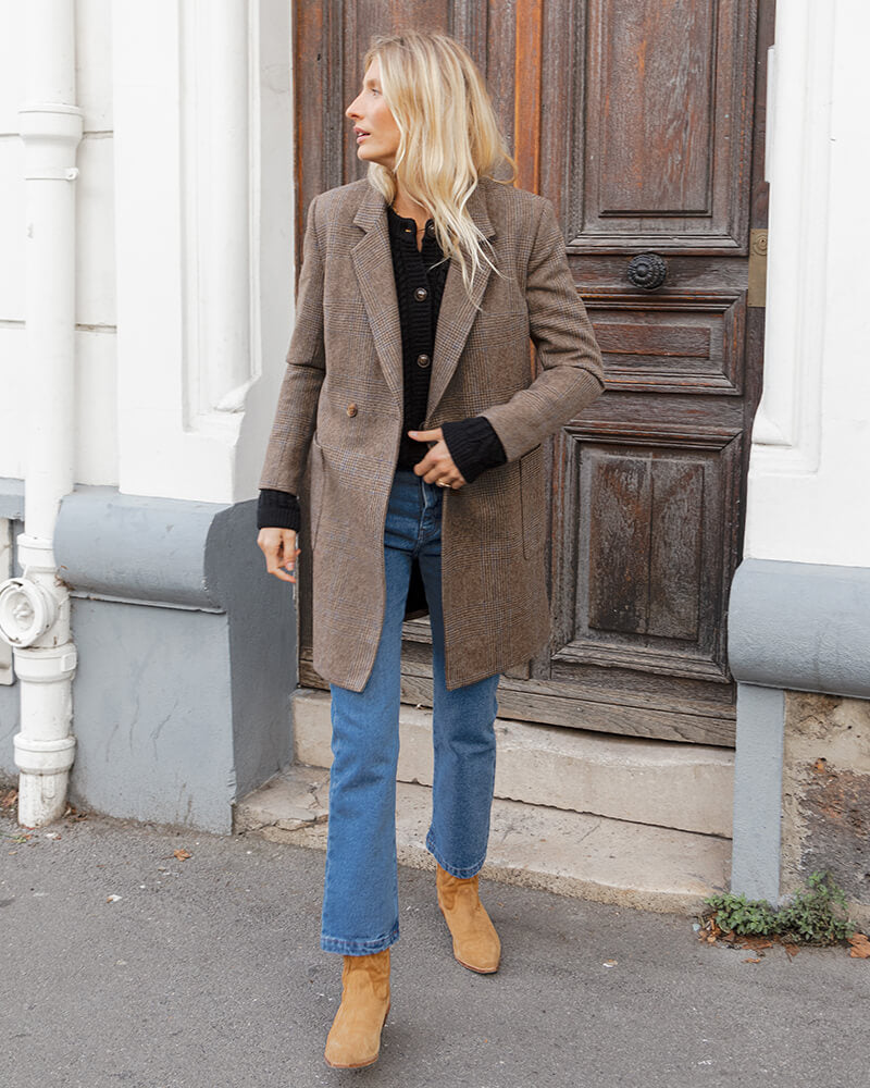 Available in a 100% Oeko-Tex certified wool tweed version (taupe background, blue-grey trim). A perfectly tailored, straight cut, enhanced with two patch pockets.
