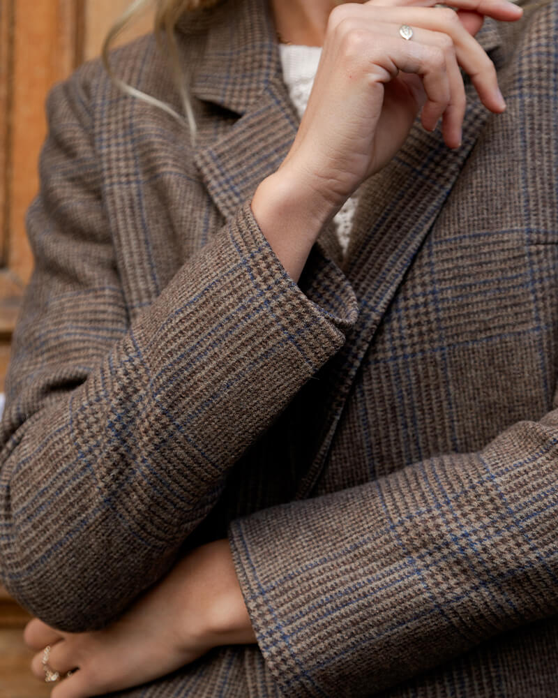 Somptueux drap de laine au motif Prince de Galles: fond taupe et carreaux bleus, gris. Cette qualité est intégralement tissée au Portugal. Richards est intégralement doublé, avec une doublure 100% italienne et certifiée.