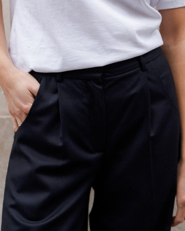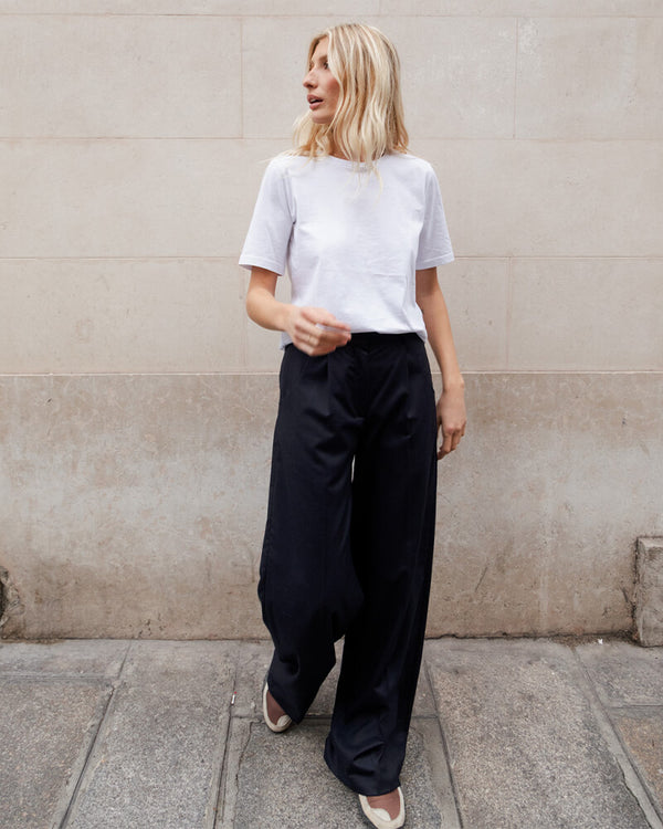 Discover our new Félix suit trousers, slightly oversized. An iconic cut, enhanced by refined and meticulous details. Made from exceptional Italian flannel in a sublime navy color. Félix will be crafted in Poland.