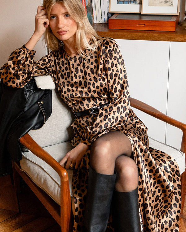 OURiconic long dresslong-sleeved, perfect for the fall-winter season. It is buttoned on the front from the waist and on the back. Lison is draped in ouriconic leopard print.To enhance it, we draped it with afabulous silk satin (shiny) leopard zero waste REACH certified.