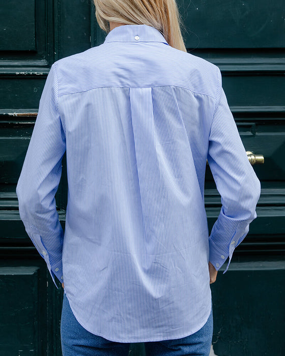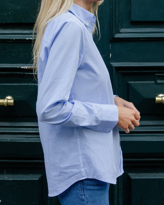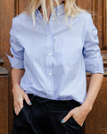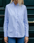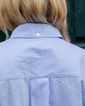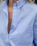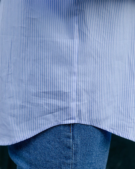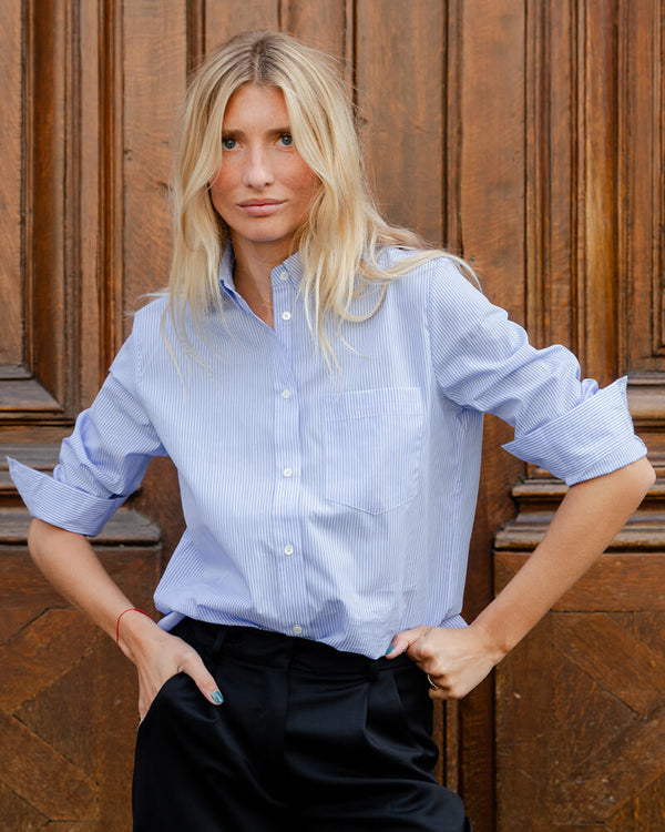 Notre chemise oversize iconique, à la coupe légèrement ample et résolument féminine, se distingue par ses détails délicats et son tombé parfait pour une élégance effortless, au quotidien comme en toutes occasions. Elle se drape d’une somptueuse popeline rayée bleue 100% coton, certifiée Oeko-Tex, pour allier douceur et engagement.