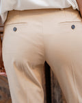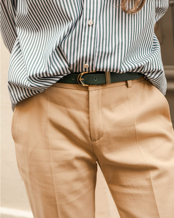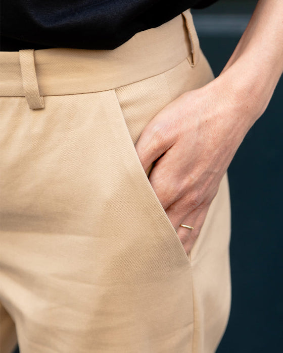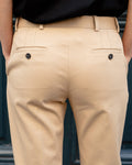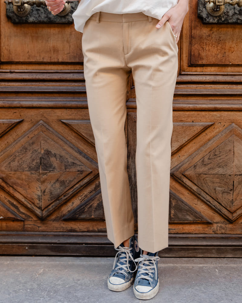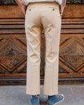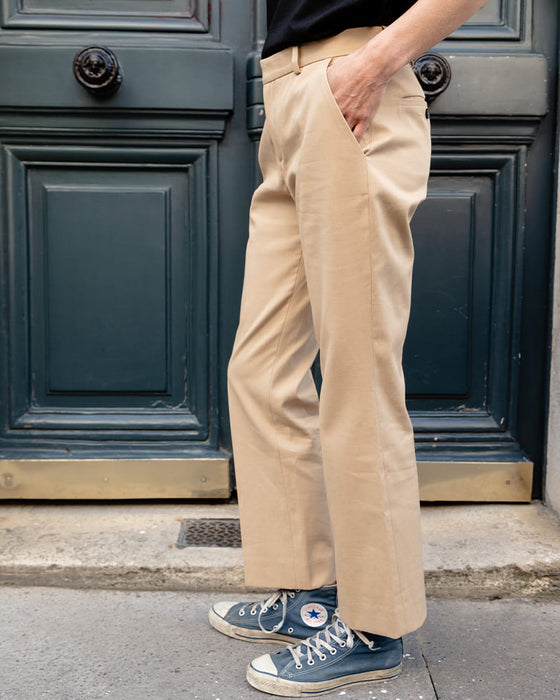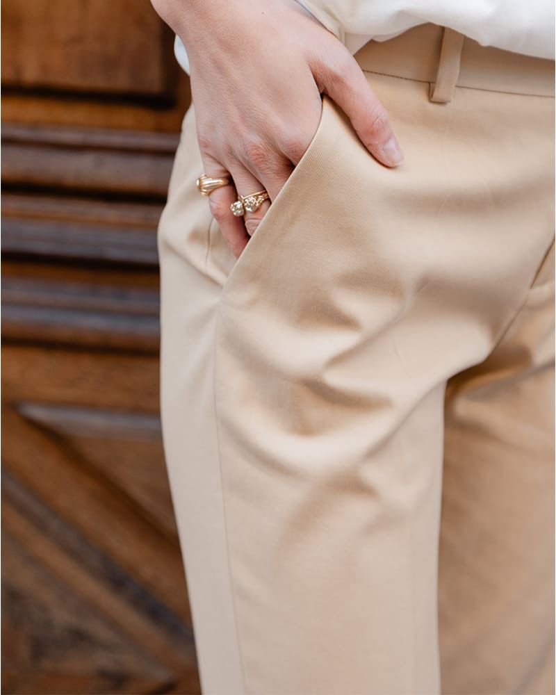 Le Nouveau pantalon chino, vient d’arriver dans son twill beige 100% coton tissé en Italie, sa coupe taille basse, et sa jambe droite sont typiques du chino iconique (coupe sur la base de notre pantalon Zweig) - le twill est zéro gâchis c’est celui de notre trench Watson un iconique à bon mixer sans s’en lasser.