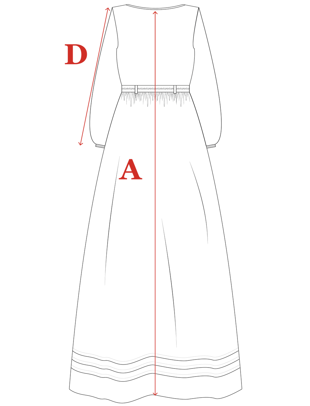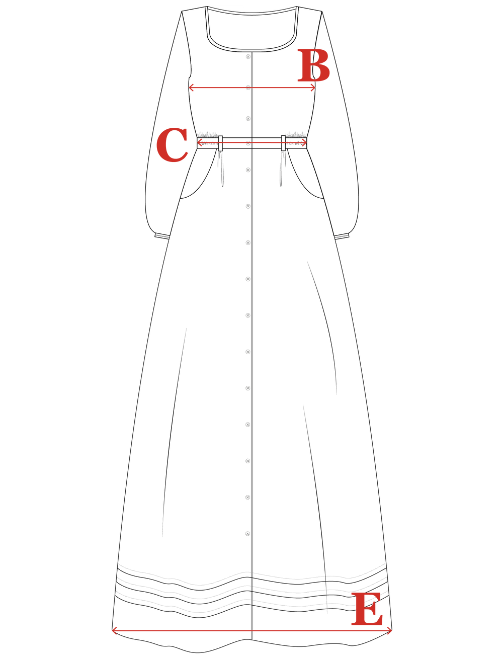 Robe longue - encolure carré - pince poitrine - découpe taille avec passants et élastique - poches côtés - ouverture milieu devant avec boutons - manches longues au poignet.