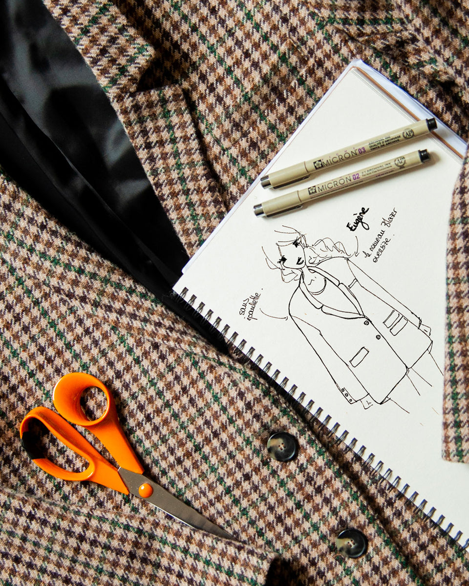 Dessiné par Charlotte. Sa coupe et son patronage, développés et perfectionnés avec notre modéliste, reprennent la base d’Edmond pour donner vie à une somptueuse veste oversize.