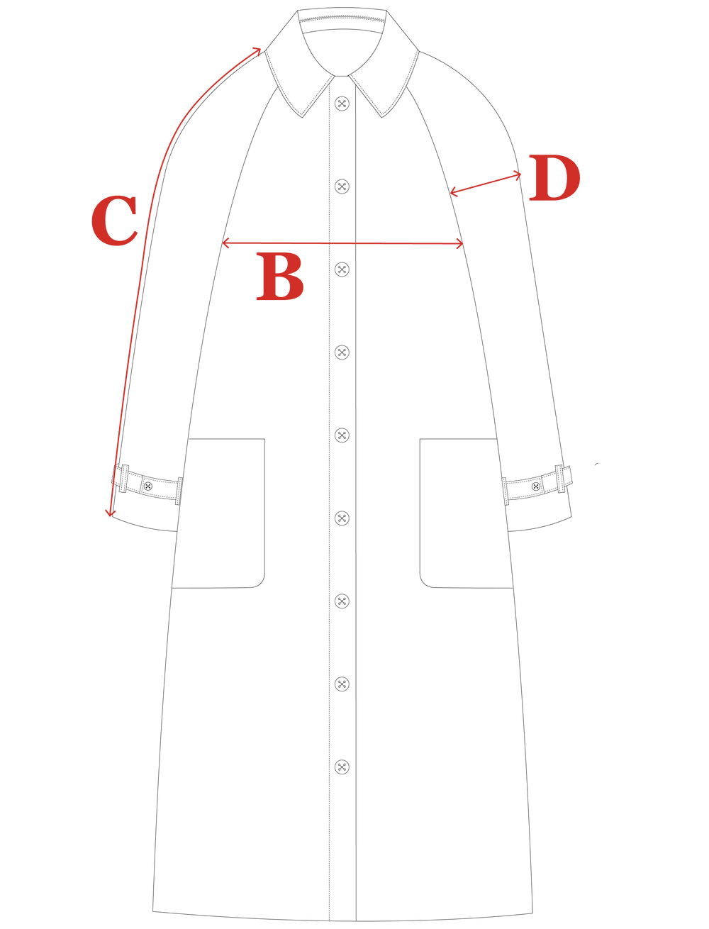 Pardessus long - rehaussé d’un pli creux dans le dos - longueur milieu dos : 114 cm pour une taille 36- fermeture avec six boutons sur le devant - col classique - deux poches plaquées sur le devant- manches raglan - passants boutonnés aux poignets.