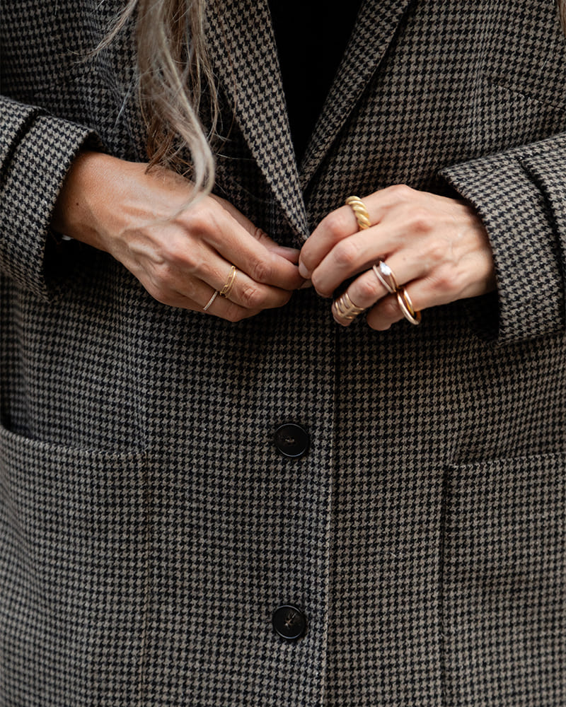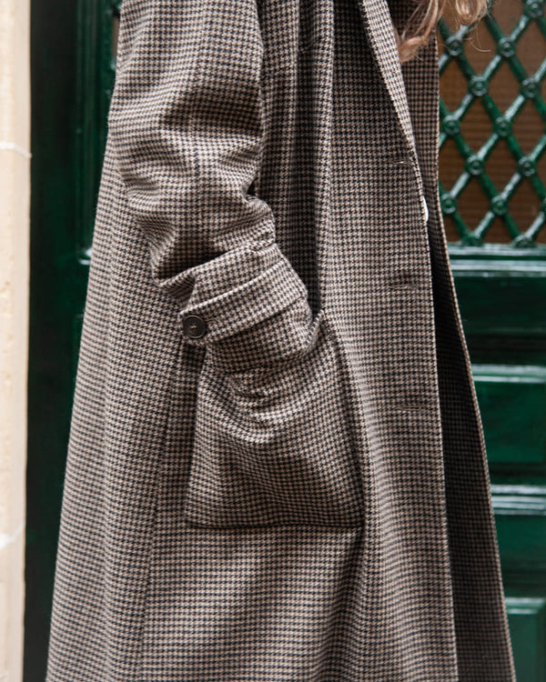 Notre manteau long au pli creux merveilleux revient. Si unique, si sublime dans sa version drap de laine en pied de poule gris et noir chaud.