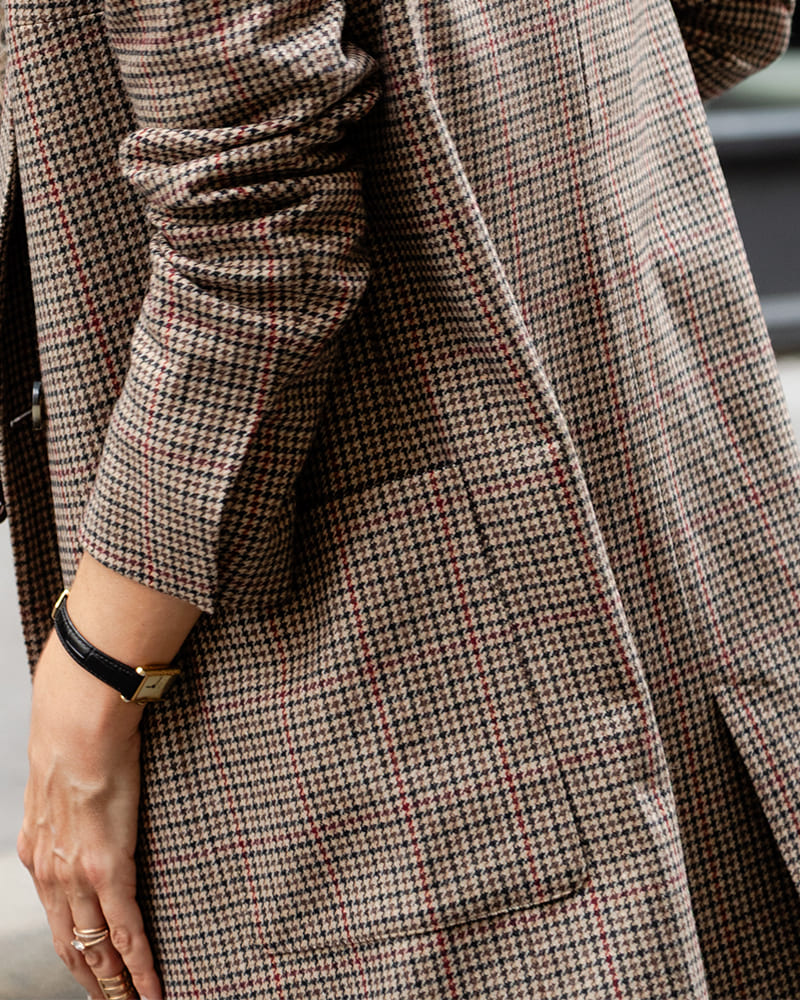 Notre manteau 3/4 idéal croisé de 2 boutons revient en réédition. Décliné dans sa version en tweed (motif pied de poule). Une coupe cintrée parfaite et droite, agrémenté de 2 poches plaquées.