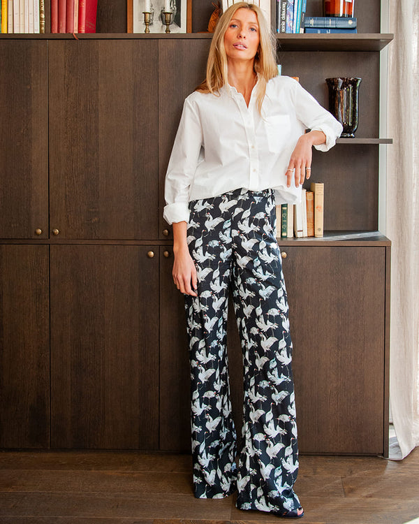 Notre pantalon large iconique depuis 2019 à la taille haute qui convient à toutes les morphologies. Nous l'avons drapé de notre imprimé grue exclusif en satin 100% viscose.