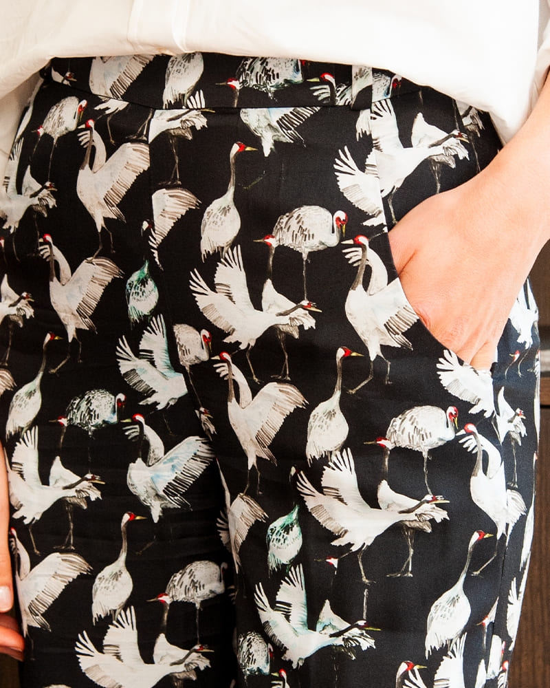 Réédition de notre imprimé Grue, à porter en toutes occasions. La matière a été faite chez notre partenaire italien : base de prêt à teindre zéro gâchis et l'impression réglementée REACH.