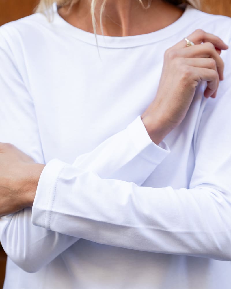 Notre t-shirt à manches longues iconique, se décline en jersey blanc, pour une allure à la fois élégante et intemporelle. Il fait parti de notre engagement "zéro gâchis".