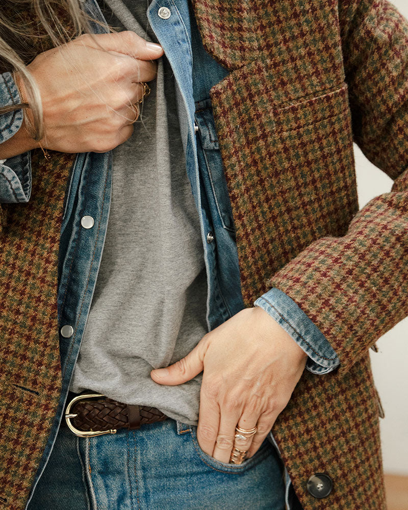 Notre blazer long iconique se drape d'un somptueux pied de poule moutarde 100% laine. Son col singulier, inversé et sa carrure ajustée vous donneront l’allure qui rime avec exception.